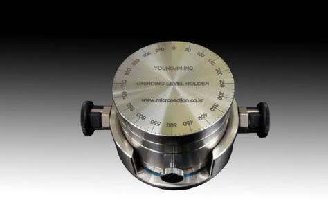Thang đo ở phía trên điều chỉnh độ dày mài. Sau khi cố định mẫu vào giá đỡ, gắn nó vào đế và đặt điểm “0”. Sau đó, điều chỉnh thang đo phía trên để đặt độ dày mài và đánh bóng mục tiêu trước khi tiếp tục công việc.